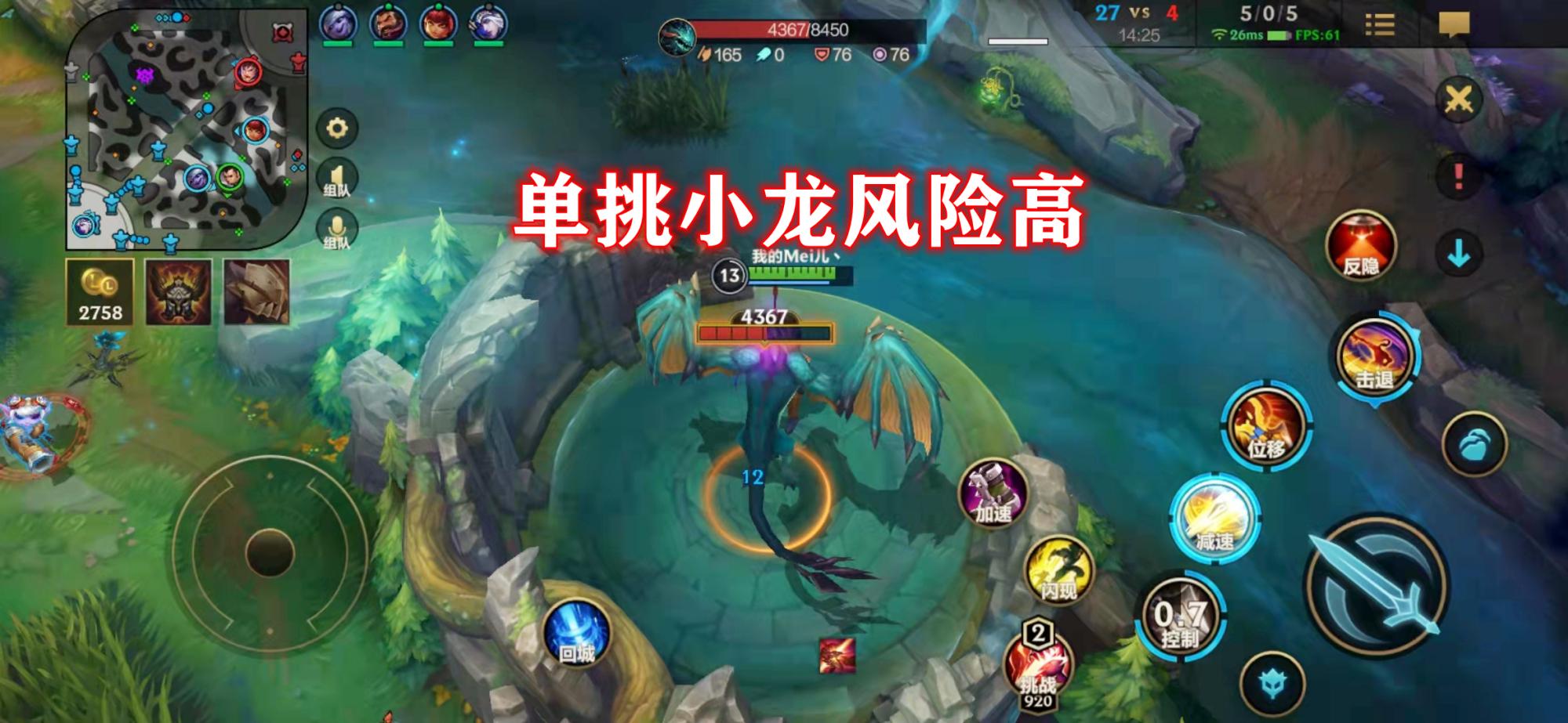 10分钟才登场的大龙是很脆的,之后每隔一分钟加强一次,所以一方阵容的优势够大,是可以抓住机会rush掉大龙的,如果单个英雄的成型速度超前,甚至可以单挑大龙,利用这一点,常常能打对方个措手不及。