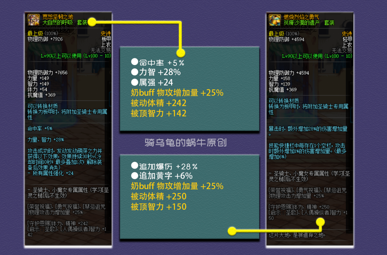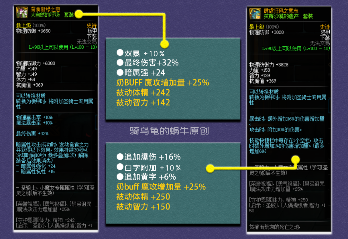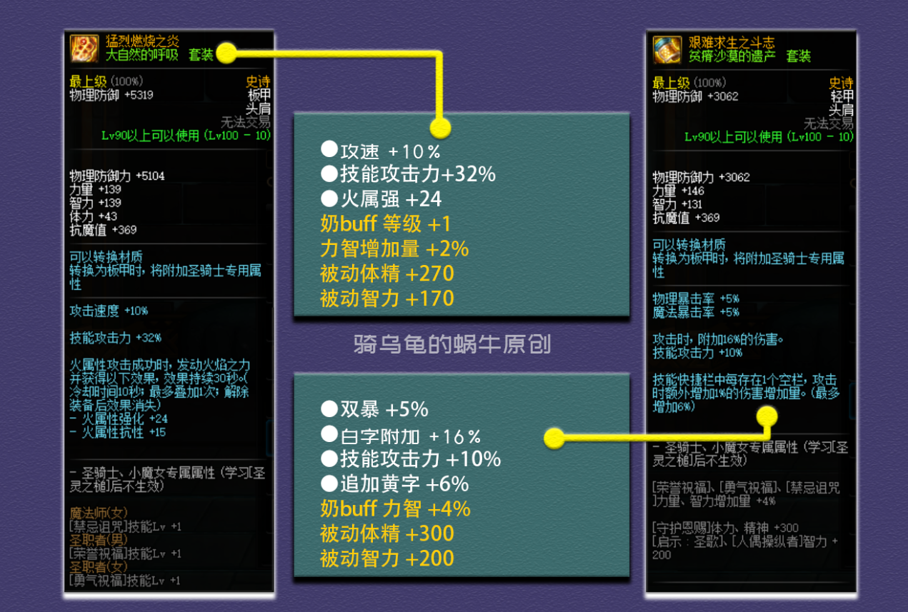 套装属性,升级的史诗套增加16%的力智、15%的追加爆伤、15%的追加黄字、23%的技能攻击力、64点属强和11%的最终伤害,综合提升率为111.82%。