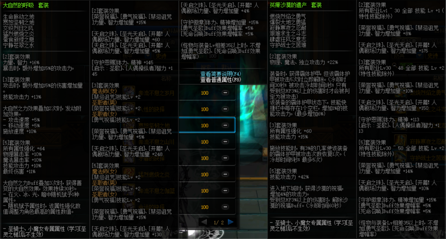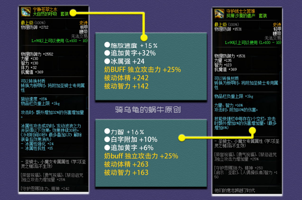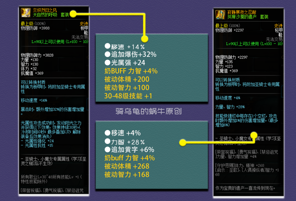 套装属性,升级的史诗套增加16%的力智、15%的追加爆伤、15%的追加黄字、23%的技能攻击力、64点属强和11%的最终伤害,综合提升率为111.82%。