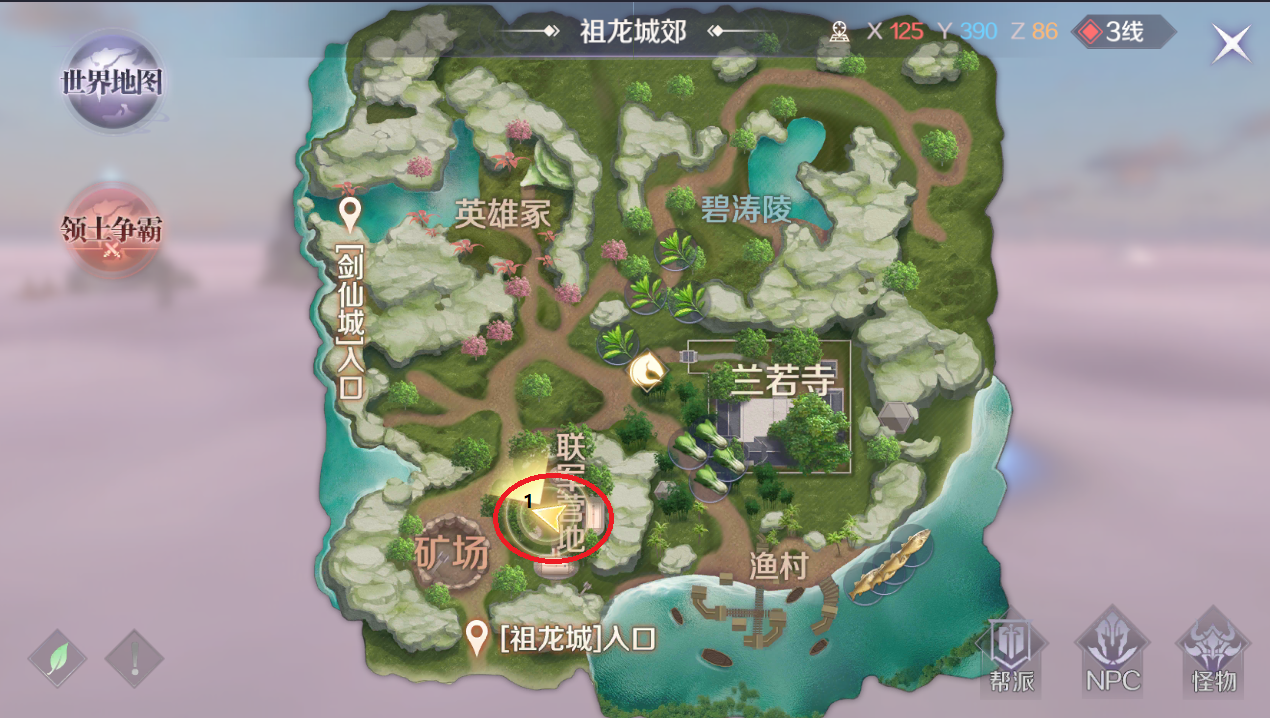 隐藏任务7:潜在威胁,坐标:X121 Y387 Z 91;位于上图标记为1的地方,在祖龙城郊联军营地遇到蟠龙发明家胡高,胡高说他的助手不见了让去天上找找,升天遇到胡高的小助手安然,接受任务。任务完成获得元神和银币。