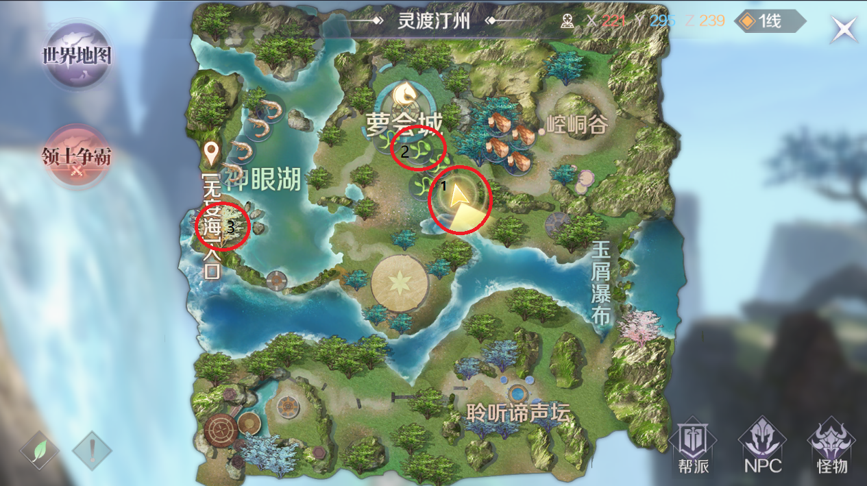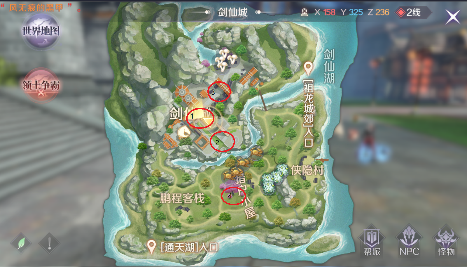 隐藏任务2:飞行挑战,坐标X167 Y499 Z220;位于上图标记为2的地方,在天上,的一个尊谭处,落地后可以看到聂云盘腿坐着。对话两次开始任务,任务为飞行钻火圈,一共钻8个火圈,8个火圈分别获得银币和元神,任务完成会解锁一个成就。