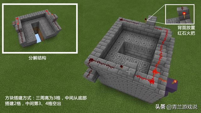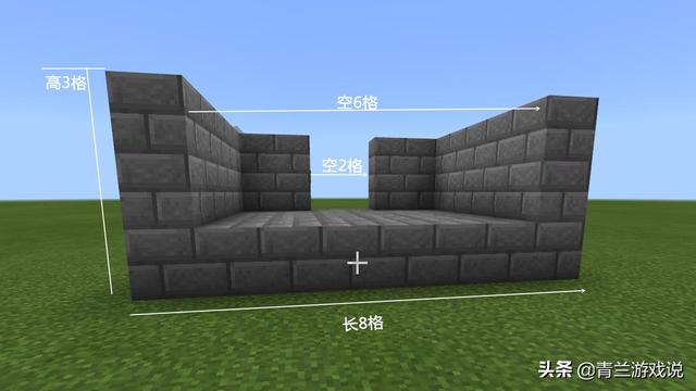 而后将周围剩余的地方堆砌起高3格的方块,两边的形状为倒立的“L”型,围起来的空间,便是陷阱内的全部占地面积了,只要刚好够游戏角色的身高大小便可以了。