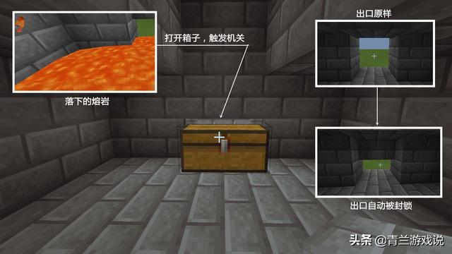 小提示:如果空间过高,熔岩落下的速度就会变慢,如果玩家们开箱的速度过快就会导致熔岩不会落下,活塞就已经收回了。