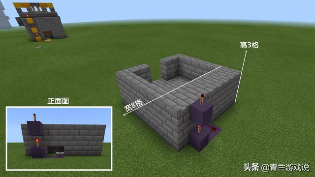 承接前面内容,在上一步所搭好的基础上,接着便是继续做好外连线路,此时需要在刚才留出的缺口外搭建一个宽两格,高3格的墙体。