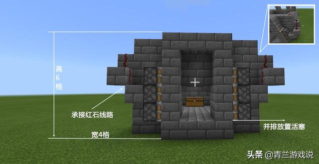 细节点:此处需要用到8个粘性活塞,且两者均为四四并连!在放置粘性活塞时,建议在陷阱的内部进行释放!除此之外,如果玩家们是在生存模式中进行搭建,建议最后再连通线路,如果提前放置红石,会容易让自身封闭在内,而浪费掉大量时间。