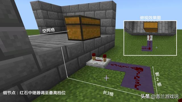 除此之外,因为涉及到红石线路,在所有的材料中,还需要有“红石中继器”,因为在连接陷阱箱的引出端时,需要又此来放大信号,并以此起到一个“二极管”的效果,防止活塞与粘性活塞线路的回流。
