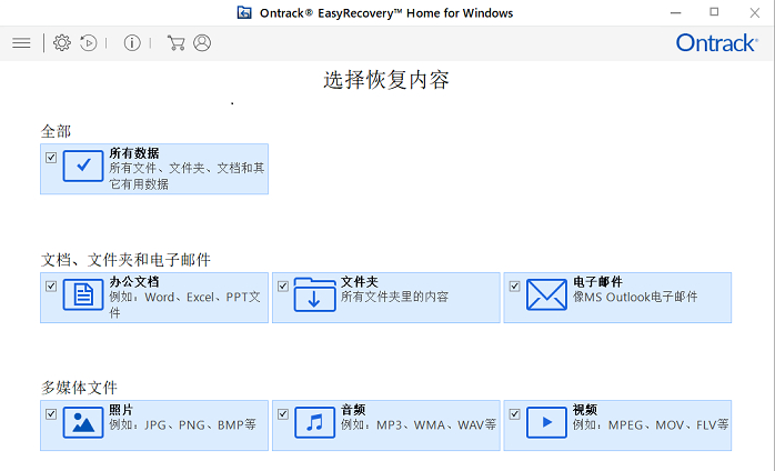把它放在前面位是因为我非常喜欢这款数据恢复软件的界面设计。因为我不是资深的电脑玩家,所以作为一名用户,我会更加在意软件的设计和用户体验。EasyRecovery的界面简洁明了,使用起来也十分简单,甚至一个不会使用电脑的人都能准确无误地使用它。