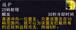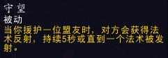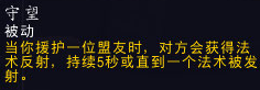 援护为常驻技能,援护友方目标后,会给目标上一个援护的BUFF,点了守望天赋后,援护队友,有两个援护Buff,在援护效果的基础上,获得法术反射,持续5秒,带法术反射的援护。