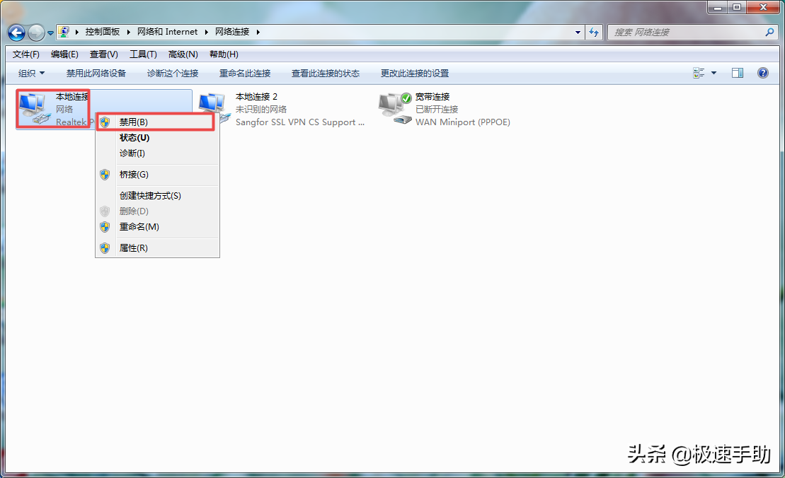 ③然后我们在网络连接界面当中,找到【本地连接】选项,然后单击鼠标右键,选择【禁用】。最后启动WeGame运行程序,然后再连接上网络就可以解决WeGame闪退的问题了。