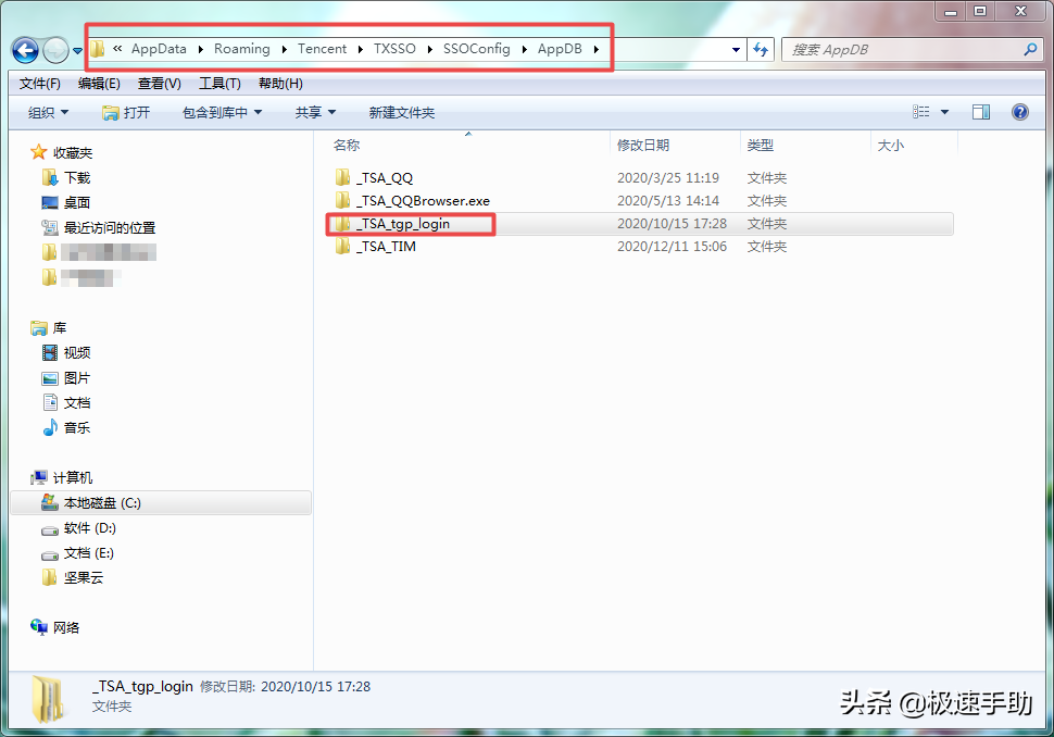【C:Users你电脑的用户名AppDataRoamingTencentTXSSOSSOConfigAppDB_TSA_tgp_login】文件夹删除,然后将电脑进行重启试试。