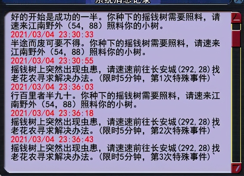 大家都知道,种植摇钱树苗是需要去照料的,一棵树苗从种植到成熟需要照料三次,每次根据系统提示去操作即可。比较常用的照料方法就是浇水一次,施肥一次,没有遇到虫害的时候就不需要除虫。而这位鬼才玩家的独门秘方是这样操作的,第一次照料是一次浇水一次施肥,第二次照料就是一次浇水一次除虫,第三次照料就是两次除虫。按照以上操作,很容易遇到特殊事件。下面来种植一棵测试一下。