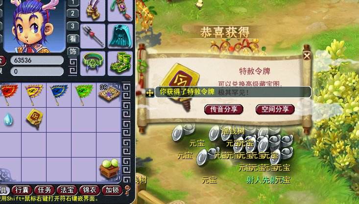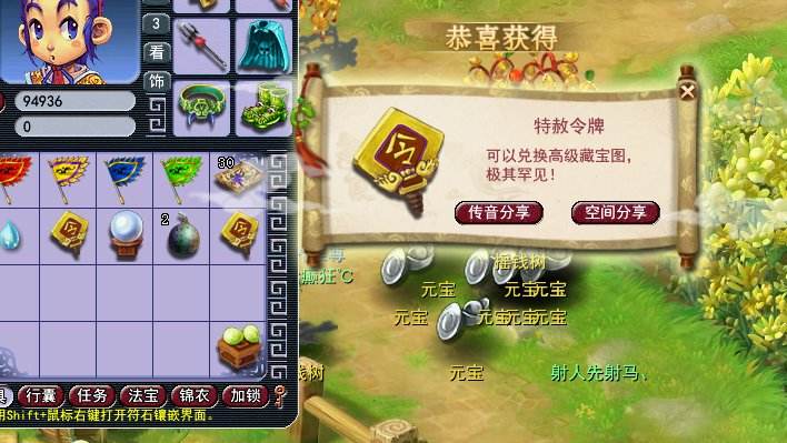 树苗成熟之后一共摇落出了20多个元宝,捡起元宝疯狂出极品奖励,各种大五宝以及彩果,还连续蹦出了几个特赦令牌。