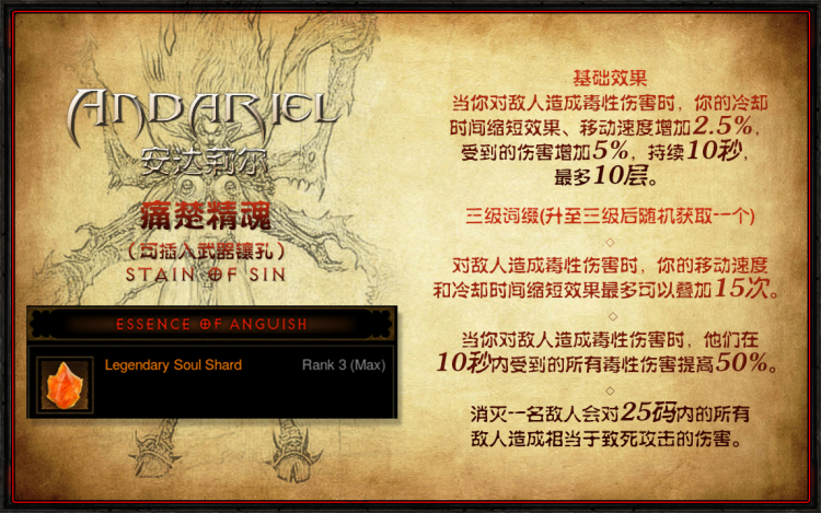 这枚灵魂碎片的基础效果实际上只需要角色身上有一条毒素点伤就可以触发。如果你不想洗武器白字的话,甚至可以给随从装备一件毒伤的武器一样可以叠层,但这样就不太容易触发额外50%增伤的三级威能了。