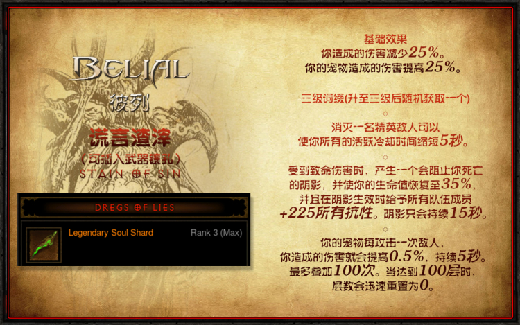 谎言渣滓是为25赛季的各种宠物玩法量身定做的灵魂碎片。没有BUG的情况下三级威能必选增伤叠层,这个叠层对角色和宠物都生效,所以实际上它对宠物玩法的最低增幅为56.25%。如果计算上神目与全能等爆发类道具的话,这一增幅还会更高一些。