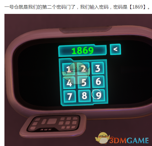 扫完海虾号后,移动开左边的路障,进入宿舍区。然后自己搜刮,这里就不细说了。会遇到第二个跟第三个密码门,第二个密码门是【1号仓】,找到后输入密码,密码是【1869】。