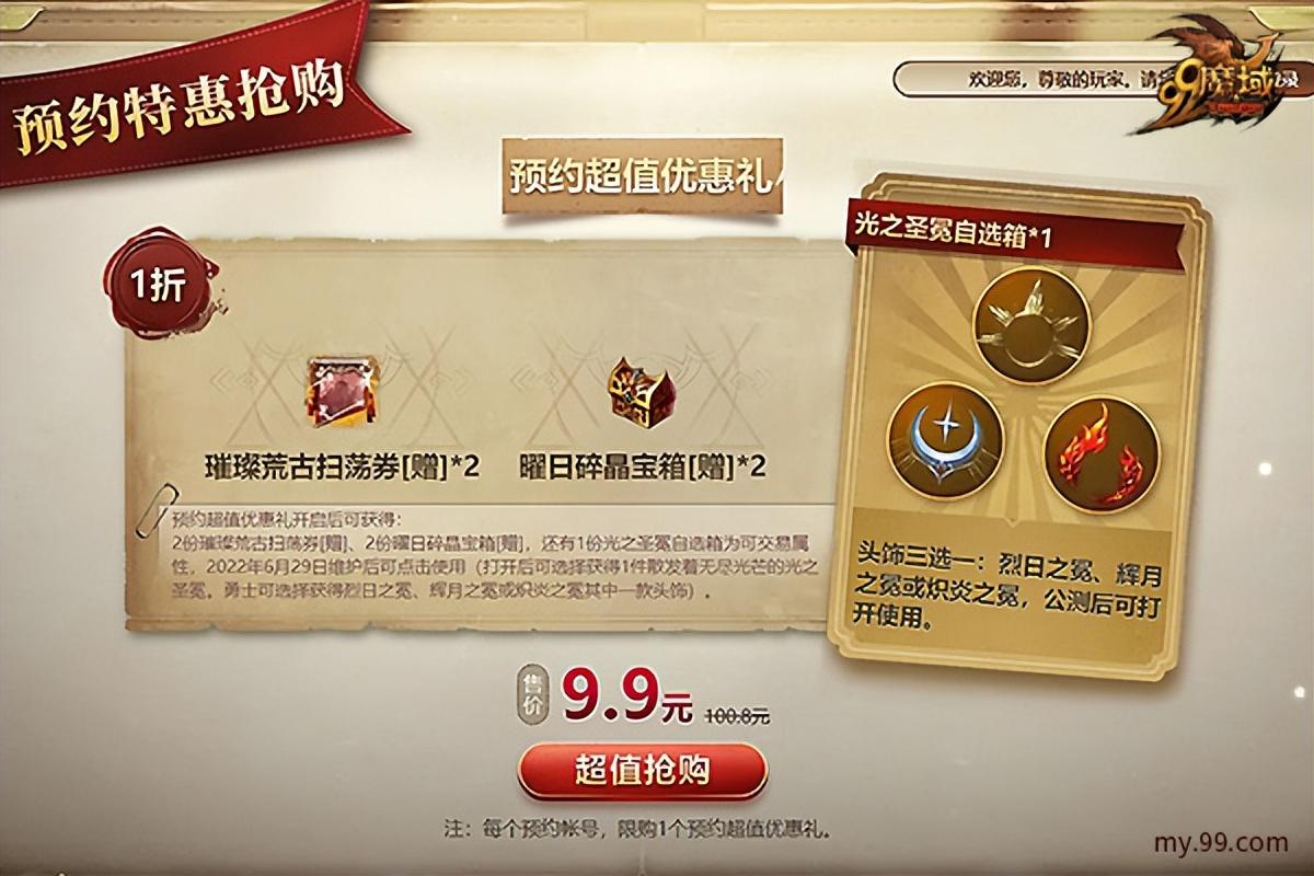 抢先预约资料片,还能享低折扣特权,价值100.8元的预约超值优惠礼仅需9.9元扫码特惠抢购!预约超值优惠礼开启后可获得:2份璀璨荒古扫荡券[赠]、2份曜日碎晶宝箱[赠],还有1份光之圣冕自选箱为可交易属性。