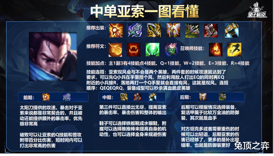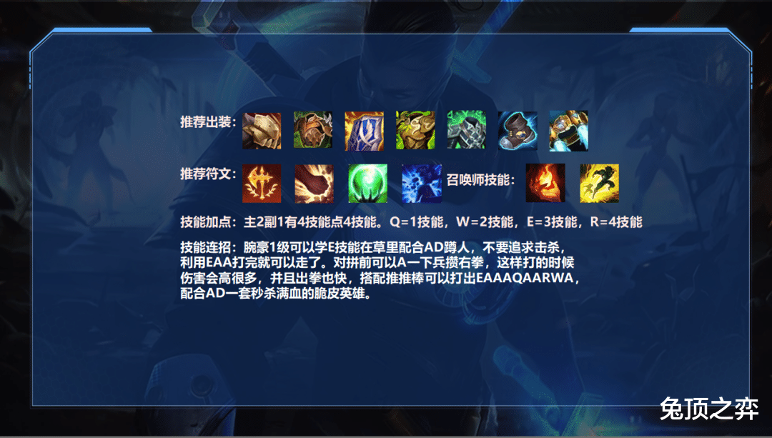 可以带爆破,对线把敌人打回家就吃塔皮技能连招: