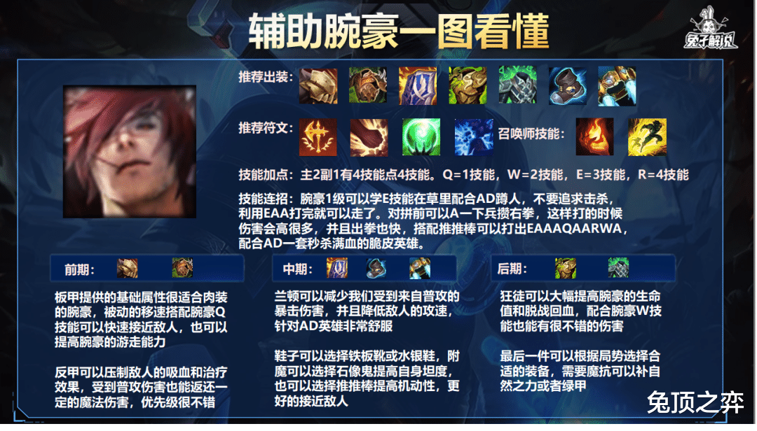 大家好,我是兔子攻略组的大马猴。今天给大家分享一下,目前版本相对来说比较强势的辅助英雄之一腕豪。为什么说腕豪辅助相对强势呢,因为腕豪的基础数值很高,前中期不需要输出装也能打出不俗的伤害,出肉装还非常抗打,有W的存在根本不用担心打不出伤害,所以今天就带大家了解一下纯肉装的腕豪有多离谱,那么话不多说,我们进入正题。
