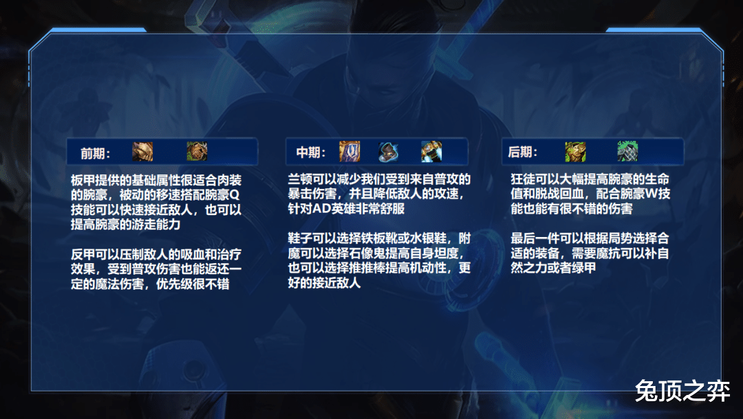 但是第一件板甲可以固定不变,板甲不仅可以提高腕豪的坦度,还可以提高腕豪的游走能力,优先级还是很高的。