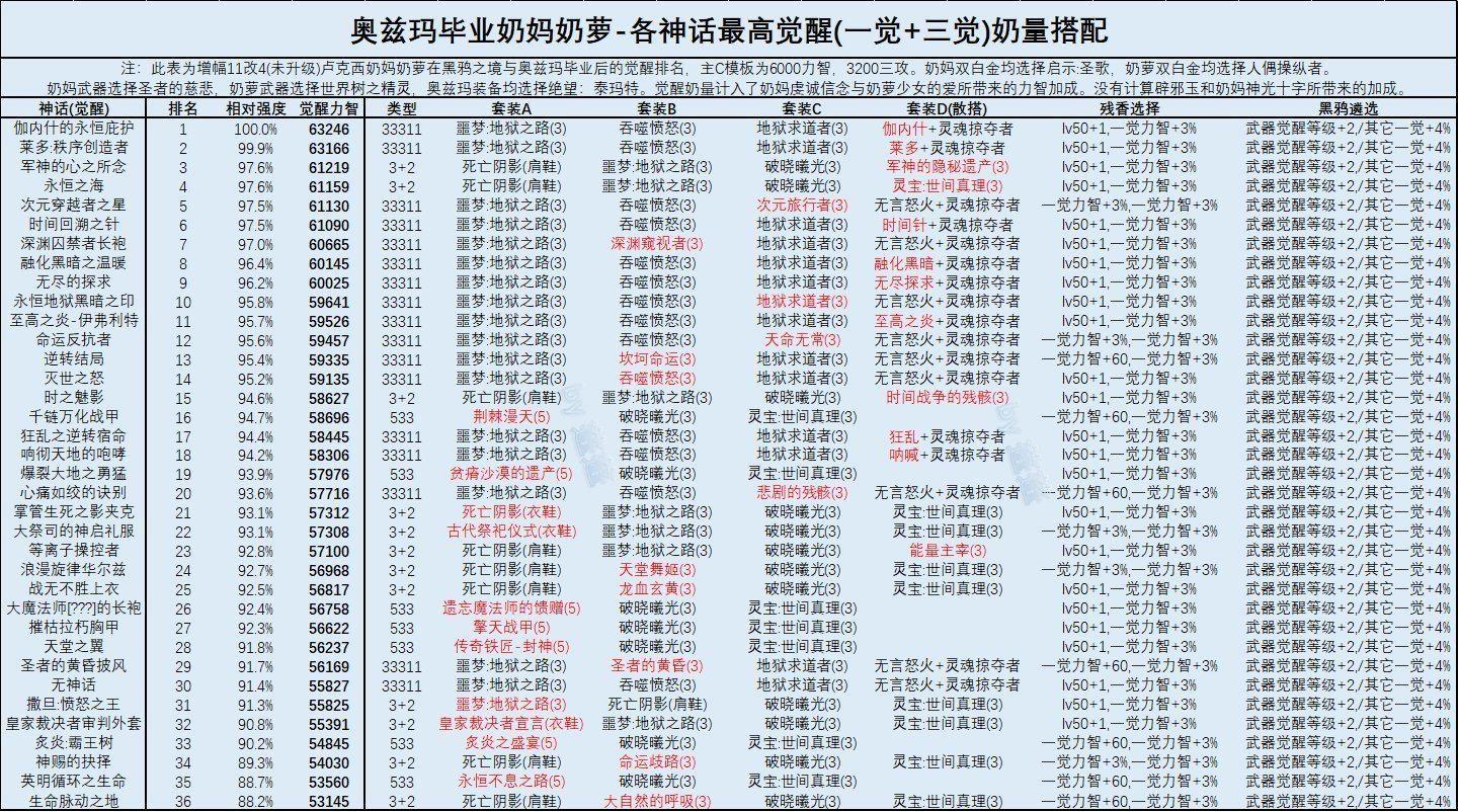 奥兹玛装备选择:因奥兹玛装备在奶职业上不具备成套功能,有一件就可以融合,遇到更好的同部位再更换即可。泰玛特:综合奶量排名第一,加成上buff和太阳全部加成为力智,版本毕业套选择。双切装备下太阳装最优选。