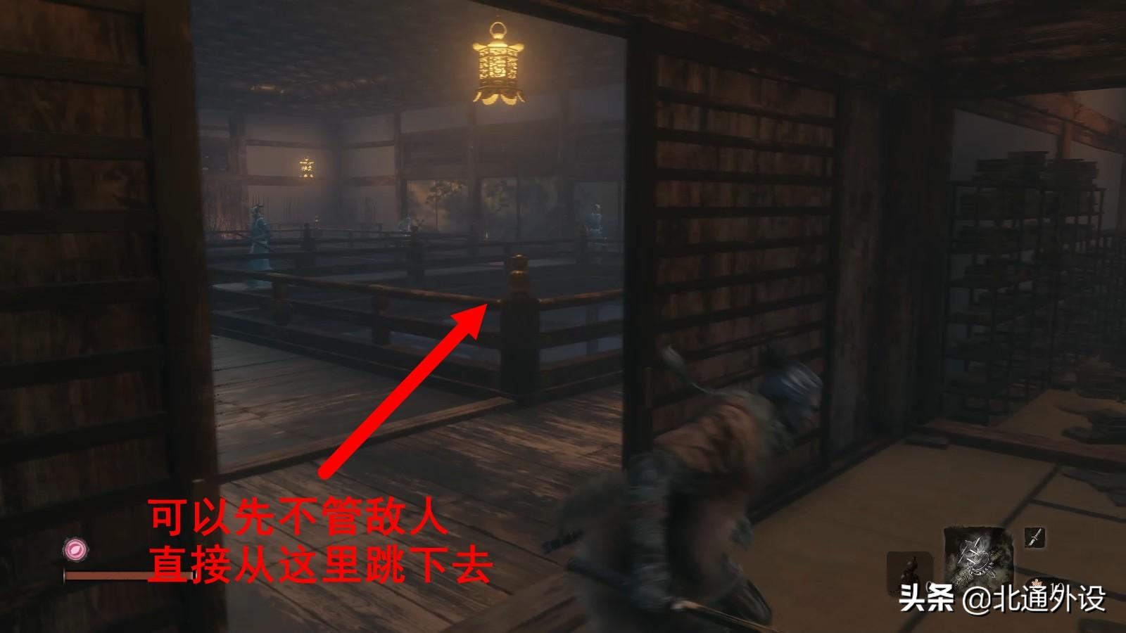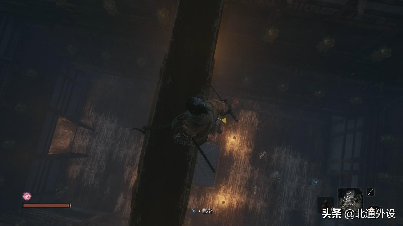 中间有一根梁可以用钩绳过去,此时可以见到下方有4名敌人。