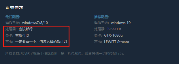 画面犹如电影级别,游戏的音乐背景同样也不能落后,音乐非常的舒缓,听着音乐就像是在娓娓道来一个古老的故事,让玩家有更深的聆听感受。其实这个游戏的制作的初衷就是为了“六便士”,工作室表示这个游戏的所有收入都会投入到《拯救大魔王3》的研发中,回头想想游戏的名字,一时竟不知道研发者们是在讽刺游戏故事,还是在挖苦自己。工作室的人员非常幽默,在游戏的系统需求上非常幽默地表达了游戏的特点,视觉小说这样的游戏,确实不需要太高的游戏配置。