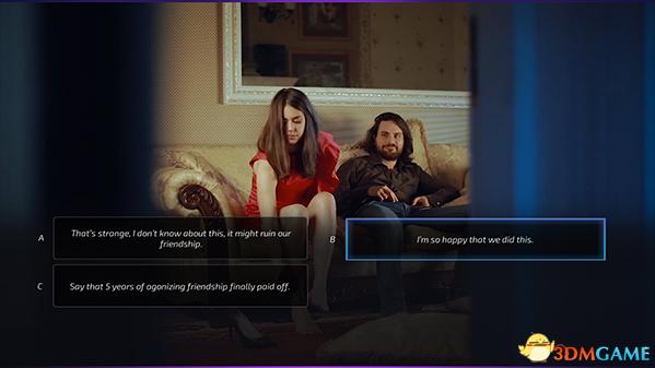 另一方面是文字描述和实际表现的差异。比如在“从女性朋友到女朋友”中,Richard与前来倾诉的女性朋友在酒精的作用下发生了关系。几分钟后两人事毕,跳出了包含“很高兴我们这样做了!”在内的三个选项,选择该项目后,不是满含深情对女性说话,Richard反而开心得像只“猴子”:“哈哈哈!我们做到了!我成功了!”想想一番云雨过后,男性突然来这么一出,隔着屏幕我都能闻到当时的尴尬味儿。