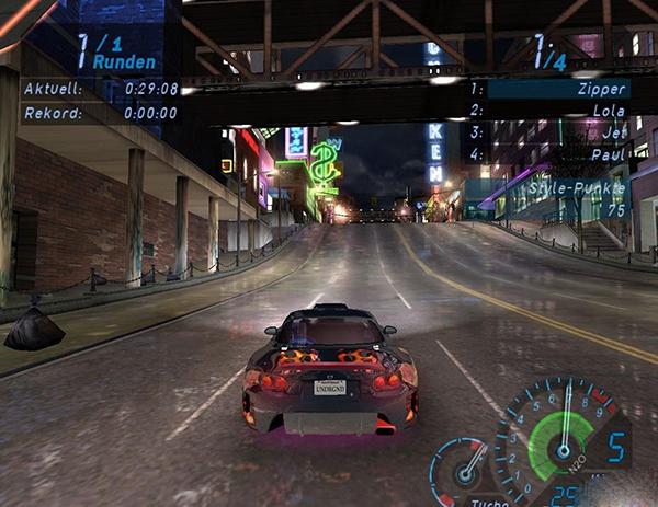 左上方:显示排名,检查点距离等。左下方:地图;前进路线由绿色高亮显示,对手车辆以橙色箭头表示。右上方:比赛时间。右下方:仪表盘;显示车速,液氮容量等。驶进终点后,进入比赛结果画面: 左侧速度墙显示此项比赛最好成绩排名,之后切换成最高通缉名单。 右侧上方显示比赛结果,下方是本场比赛获胜后获得的改装车零件。第一场比赛获胜后,就进入自由模式了。下面是一些建议心得:先用最初的几辆车(在劫车点能找到车,你如果不知道劫车点位置的话,在你第一辆车的周围仔细找找就能找到一辆还不错的奥迪和一辆宝马),用这几辆车完成他们的简单赛事和中等赛事,尽量得金牌~等赛事甩掉警察有些困难,你可以这样:找到能装牌子飞跃的地方,让警车都跟在你后面,冲着飞跃点开过去,然后紧急刹车,警车刹不住就能冲出去好几辆(最多跟在你后面的是4辆警车),然后你快速的掉头往相反方向跑,跑出警察的视野范围后,找个角落停住,等着比赛结束就行了~如果你的车不好,千万不要跑到视野盲区后还开足马力使劲开,因为路上的警察很多,装上一个你就前功尽弃了~