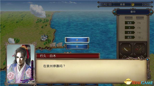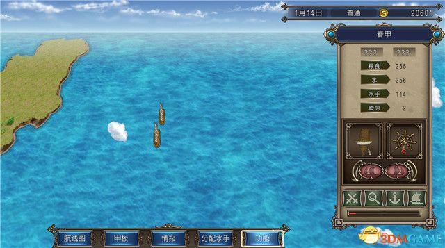 由此会有当前航行的菜单,例如方向,补给品(粮食,水,水手,疲劳值)状态。