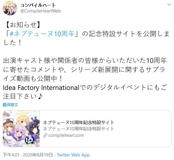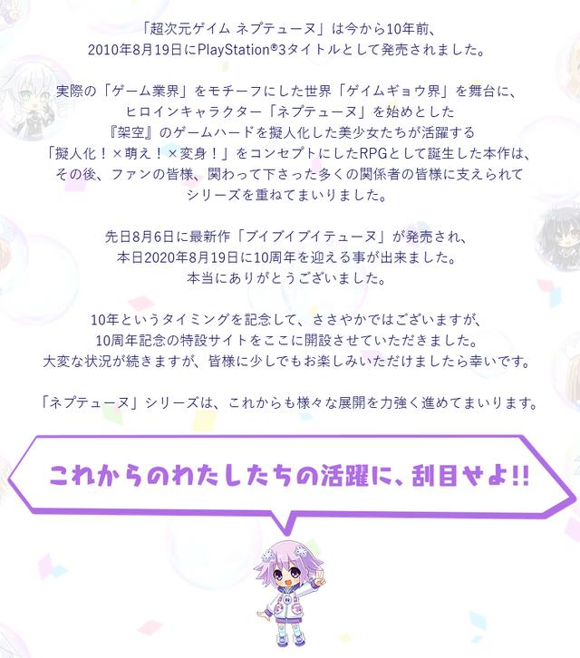 2020年8月6日,《超次元游戏海王星》系列最新作《VVV战机少女》在日本正式登场,非常感谢大家的支持。为了纪念10周年,我们特别设立了这个网站,尽管目前大家的处境都比较艰难,但是我们希望这些作品可以为大家带来快乐。