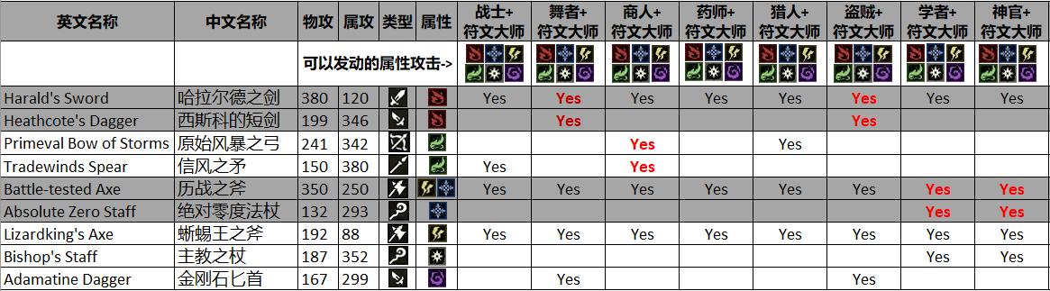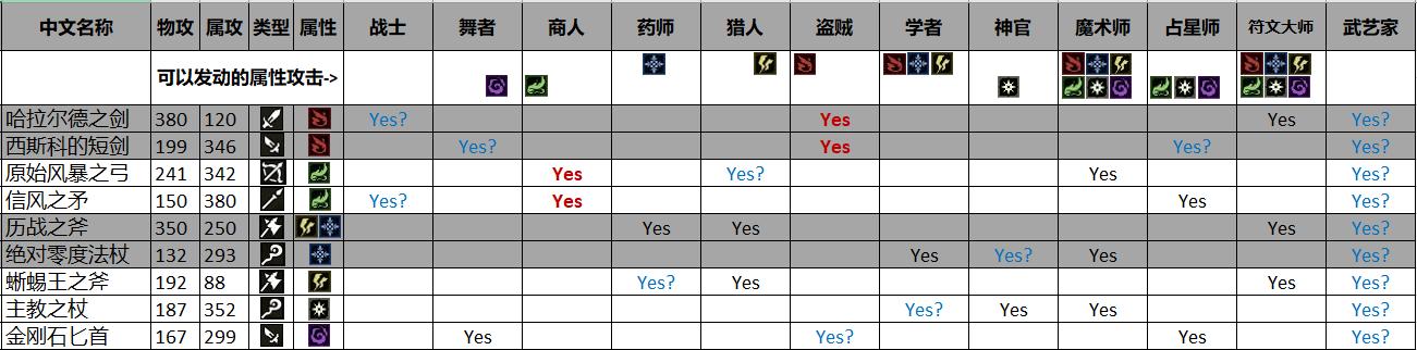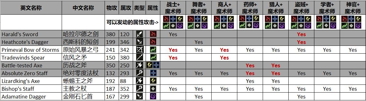 九把武器,八个基本职业,四个隐藏职业对应的属性属性攻击总结。