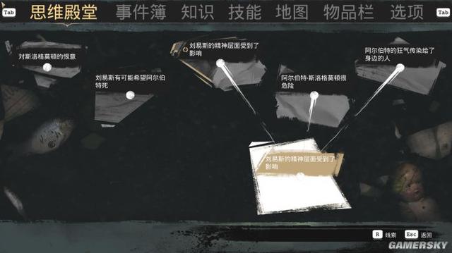 基于这两个能力,我们得到的线索都会收录在思维殿堂里。在里面我们还可以整理线索,对其进行分类连线。连线成功之后,思维殿堂会生成新的推论和线索,从而继续追踪案子推动剧情的发展。最终我们会得出一个完整的线索链,以完成一个章节的探案。