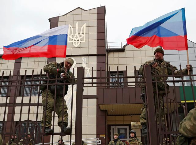 当地时间2022年2月27日,在卢甘斯克的斯坦尼齐亚卢甘斯卡,卢甘斯克武装力量的民兵在银行外手持俄罗斯国旗。
