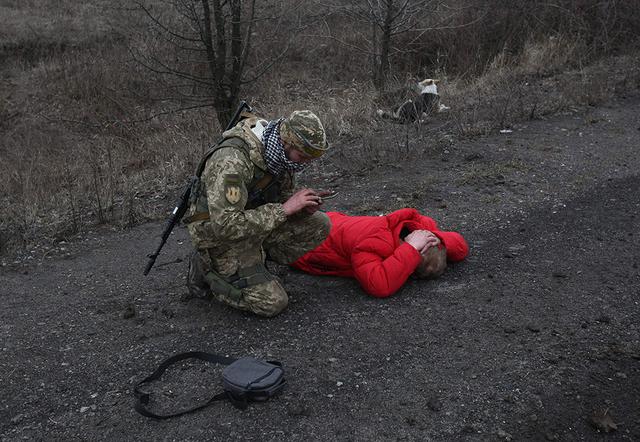 当地时间2022年2月26日,乌克兰卢甘斯克,一名乌克兰士兵在阵地附近检查可疑行人。