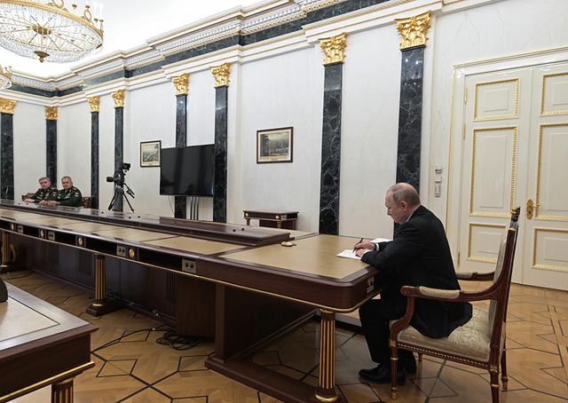 当地时间2022年2月27日,俄罗斯莫斯科,俄罗斯总统普京会见俄罗斯国防部长绍伊古和总参谋长格拉西莫夫时表示,命令俄罗斯战略威慑力量进入特殊战备状态。