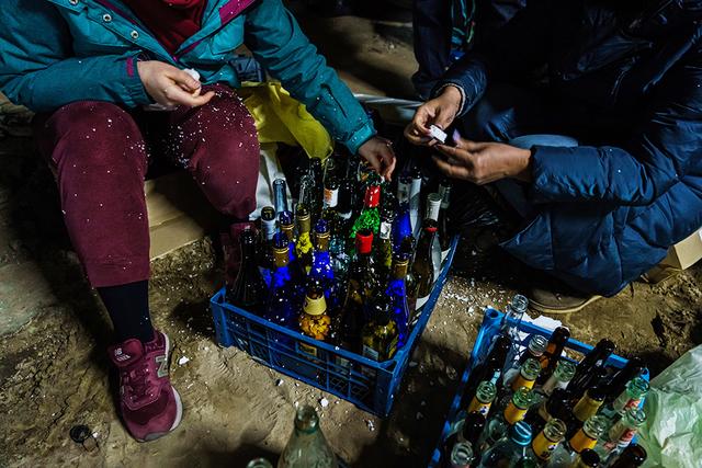 当地时间2022年2月26日,乌克兰基辅,来自领土防卫部队的志愿者聚集在一个前哨站、收集武器、接受训练并接受任务。不少人用玻璃瓶自制燃烧弹。