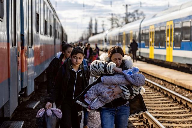 当地时间2022年2月27日,乌克兰难民从乌克兰前往匈牙利。联合国难民署称至少15万乌克兰人前往邻国避难。