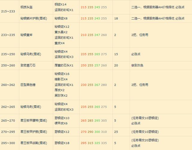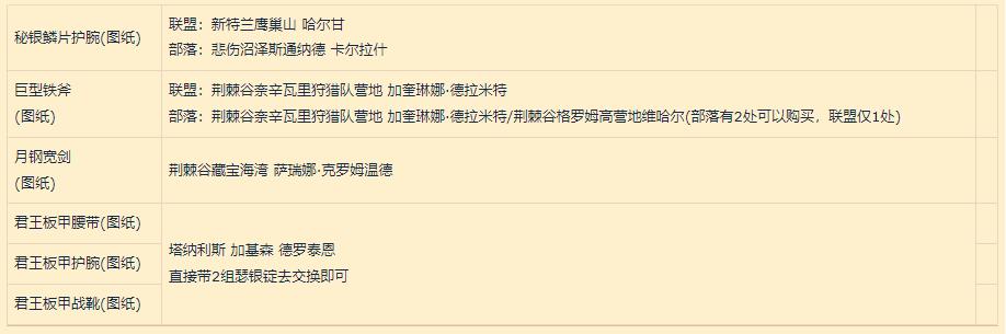首先我们需要准备一些图纸,这里要谈一下最著名的秘银马刺图纸,在锻造升级计划中大约升20点全靠这张图纸,可以帮我们剩下大量秘银锭,一般AH价格在200-300G都是可以考虑入手的,性价比相当高,另外必需的图纸我列在下方表格中: