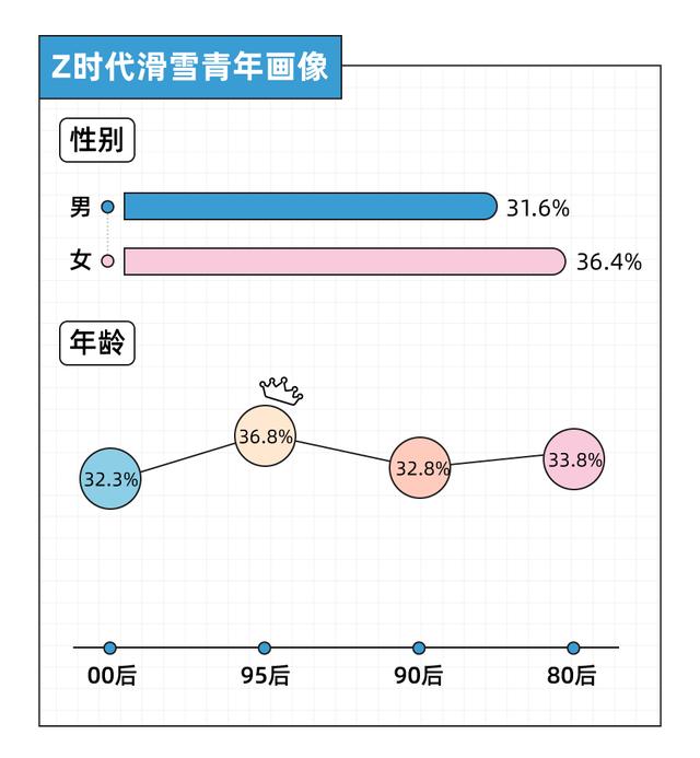 在各年龄段中,95后是当之无愧的滑雪先锋,甚至超过了中产居多的80后。