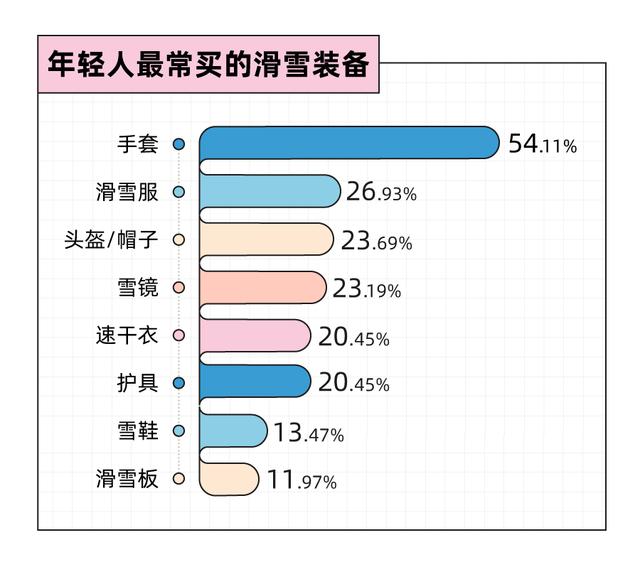 毕竟年轻人的钱都不是大风刮来的,如果预算有限,大家会优先买什么呢?在滑雪鞋服、滑雪器材和滑雪配件这三大类滑雪装备里,精打细算的年轻人首选物美价廉的滑雪配件,手套成为滑雪小白的第一件入门单品。