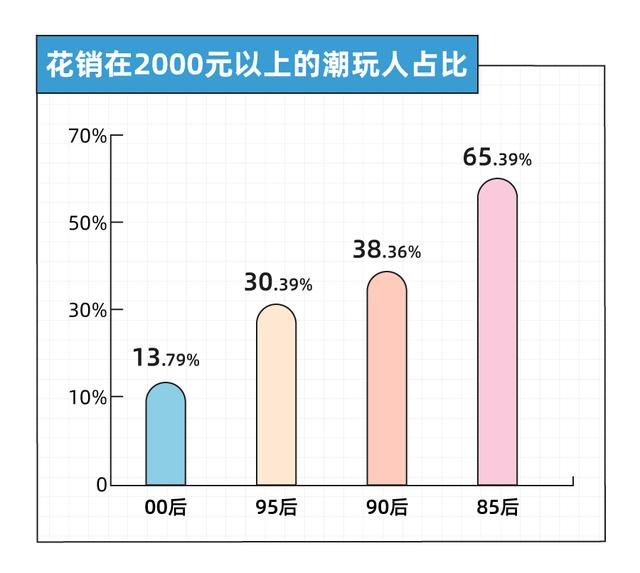 随着年龄增加,财力增长,现今潮玩圈的年轻人潜力不可估量。我们统计了迄今为止消费2000元以上的潮玩人占比,从00后到85后,钱烧的越来越多。其中,46.15%的85后玩具数量在20个以上。