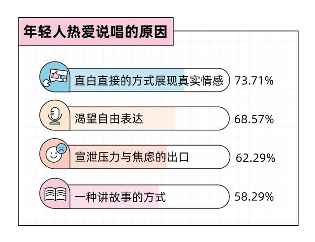 调查数据显示,Z时代热爱说唱的首要原因是“它提供了一种展现真实情感的方式”,说唱即态度。以聚集了新一代说唱rapper的综艺《少年说唱企划》为例,Z时代的rapper们更加注重自我表达,节目中鬼马精灵的女rapper反返,用河南方言说唱的ksovii,还有通过“青春文学”式说唱聊自己身边事的灵超,他们不惧质疑,不怕挑战,综艺即为当下年轻说唱圈的一个缩影。