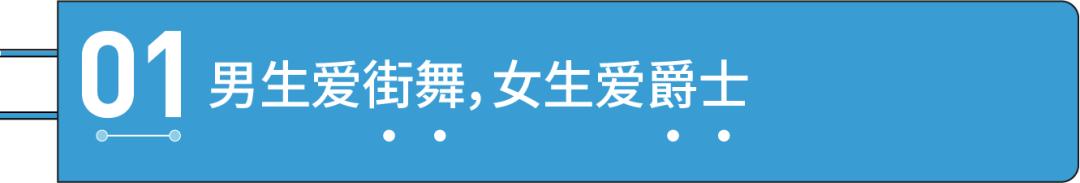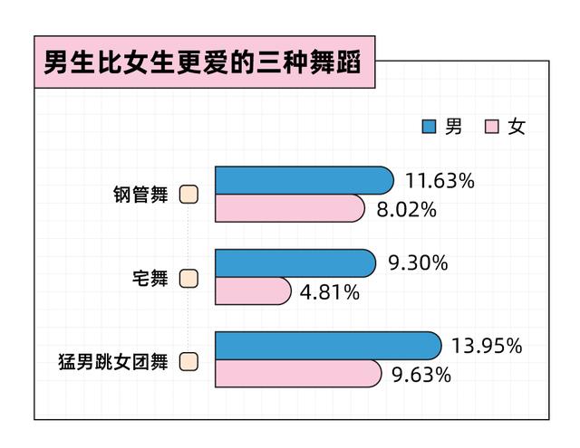 另外,我们还意外发现了年轻人对于舞蹈的一些小癖好,有三种舞蹈男生比女生更喜欢看,分别是:钢管舞、宅舞、猛男跳女团舞,后者一度风靡互联网短视频,一众巨石强森式的硬汉猛男,突然开始翻跳撒娇,巨大的反差萌成为无数年轻人的快乐源泉。