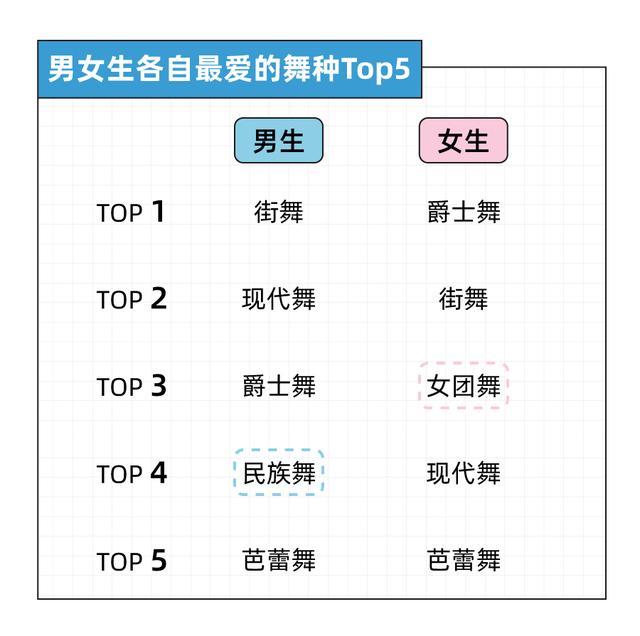 舞蹈的种类繁多,哪一种最受年轻人欢迎?调查数据说明,年轻人最爱看的舞蹈类型Top5分别是:街舞、爵士舞、女团舞、现代舞和民族舞。