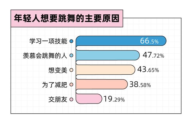 相比于变美和减肥,年轻人学习舞蹈更注重于实用性,学习一项技能,有机会成为party中的dancing queen,是更多年轻人学习舞蹈的小私心。每学会一个动作,每跳好一首曲子,来自心底的成就感,让每个人都可以站上心中的C位。