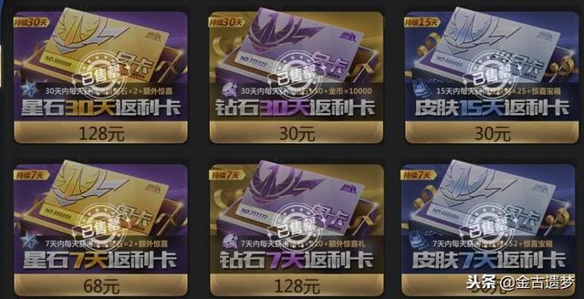 2.月卡党:游戏的月卡分为钻石月卡30元(每天50)、星石月卡128元(抽英雄的道具,每天2)、皮肤半月卡30元(买部分皮肤的道具,每天25)三种。