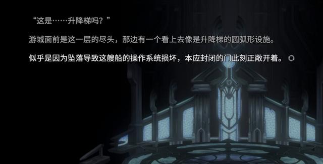 其次是配合剧情发展,堆叠细节元素。光是有镜头感还不够,《悠久之树》的剧情画面还比传统AVG内容多了两类细节:第一种是类似四格漫画的Q版画面,它除了可以调节严肃的剧情氛围外,还能让内容更聚焦在人物的情感设定上,为玩家营造更活泼生动的角色形象;第二种是与文案相配合的场景画面。例如主角在遗迹中乘坐升降机时,画面当真出现了模样别致的电梯机关,填补了许多玩家无法脑补到的环境细节。