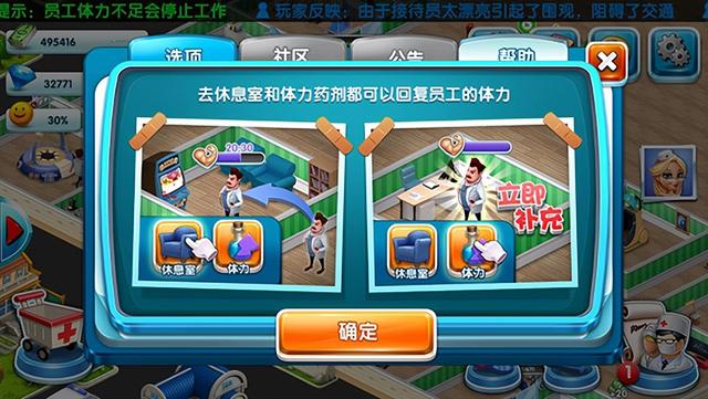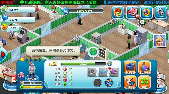 如果体力药水用完了也没关系,我们可以让劳累的医生进入休息室来补充体力,初期休息室内只能同一时间容纳两个人,如果想容纳更多的人,就需要升级休息室喽。级别越高的休息室容纳人数越多。但是切忌还是不要让所有的医生同时劳累比较好,要不然就没有人给患者看病喽!