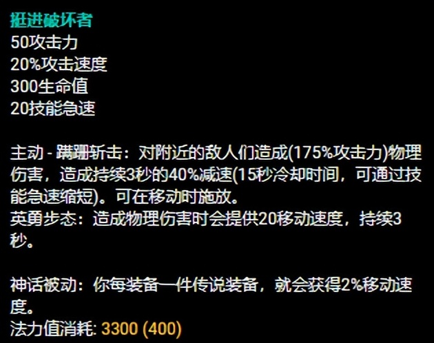 许多人关注排眼刀(阔剑)的时候都只关注到了“封锁”的被动,能可以使对手的眼显形,这样男枪作为打野位在Gank前可以对部分地域的视野进行控制。但是阔剑最重要的特点还有技能的基础属性有提供10穿甲+15的技能急速,这对于依靠高额面板伤害技能打输出的男枪都属于“刚需”的属性,所以这件装备对于男枪的契合程度非常高。而挺进破坏者这件装备在提供可观移速的同时,主动效果可以造成一定的AOE伤害,同时造成减速效果,男枪属于需要贴身的英雄,出挺进可以更好的发挥男枪的技能特点黏住对手打输出,尤其是针对脆皮英雄伤害非常容易拉满,而挺进配合排眼刀的穿透效果将男枪的输出能力拉满。所以在12.9版本挺进排眼刀男枪的玩法才在这个版本相应崛起。