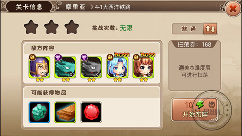 普通难度的副本每次消耗10点体力,每天可以进行无限次数的挑战,通关后可以进行扫荡,前期主要用来快速获取经验以及各种装备用来给英雄进阶!